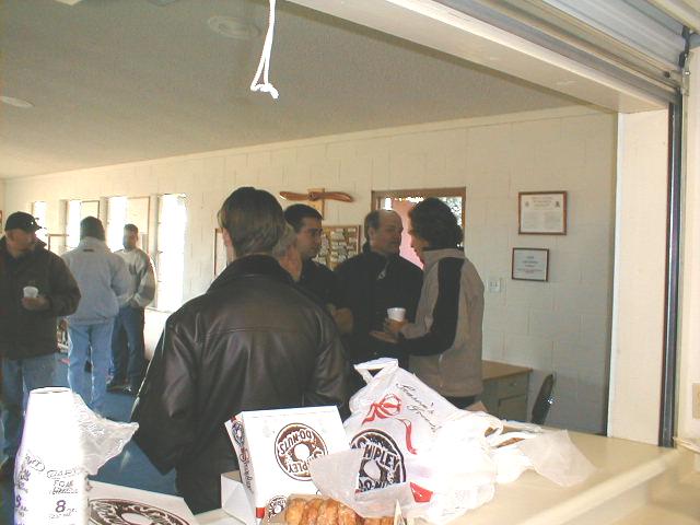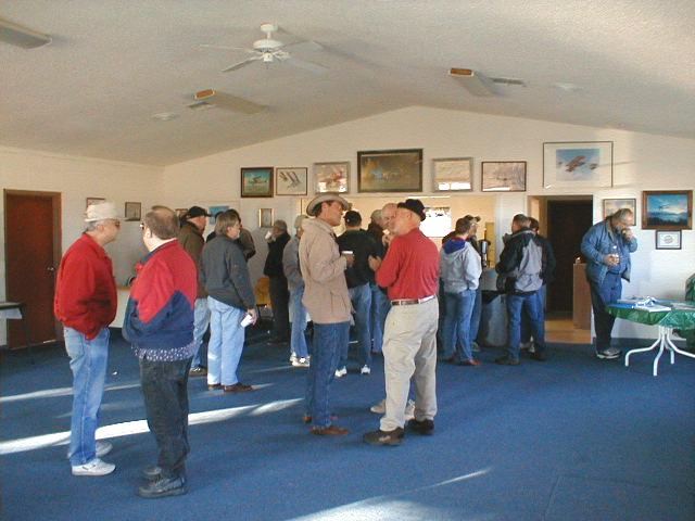 The crowd begins to gather in the EAA Chapter 35 clubhouse. At the table on the right is Dave Morris, a Dragonfly guy who brought his core engine to the College for a tear-down.