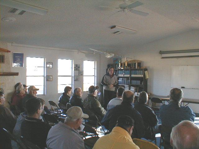 William begins the briefing and philosophizing. Suspended above him is a model of Howard Hughes' "Spruce Goose" Hercules, with scale Corvair engine power ;o) At the close of the briefing there were 40 souls present in the room, including William.