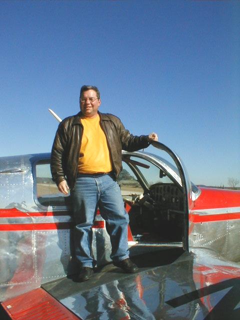 Doug Steen and his dad, Wally Steen, flew their beautiful V-tailed Bonanza to the event. Here Doug exits the cabin after a perfect squeaker landing.