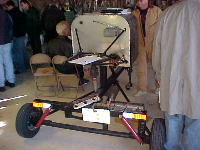 William's engine test stand, which tracked straight and true behind Gus' pickup all the way from Florida to Texas with almost no weight on it. On the right side of the trailer frame are two cut-down valve covers that are used for adjusting the valves while the engine is running.
