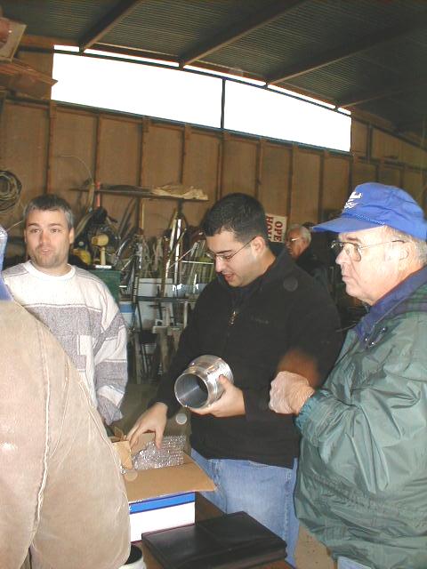 In the black pull-over is Charles Navarro, the "Nickies guy". Very polite, patient, and a straight shooter. Everyone was amazed at the feather weight and flawless machine work of his products. Ted Forringer on the left, now fully awake.
