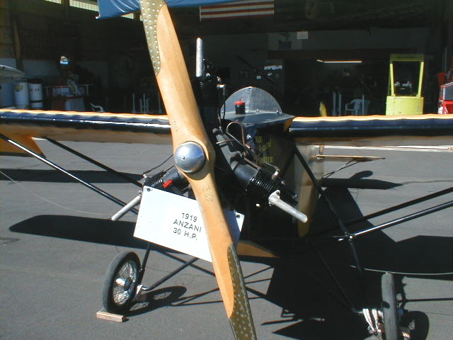 Closeup of the Anzani with its open valve train. Fuel tank is in the top cowling but would have to be in or over the wing centersection in the Henderson version with high wing.