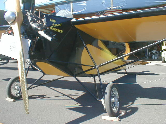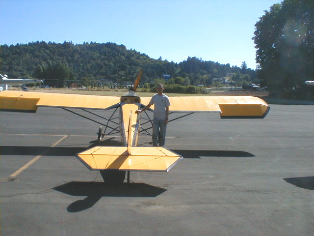 View with me standing by the Anzani Longster shows scale. This version has roughly a 12' wing on each side while the Henderson version adds 3' to each wing to make them about 15' long each. With a triangular fuselage section at the top, the root ends of the Henderson Longster's wings butt together at the mounting bolts, which makes its wingspan just about 30 ft.