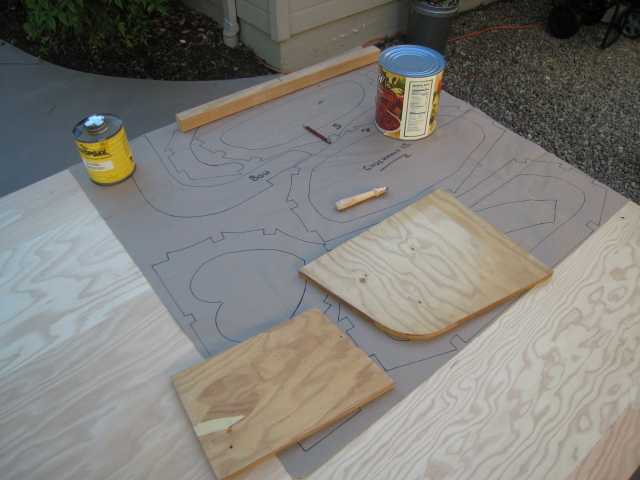 This is where it starts. I've started laying out the frames, stem, and stern on 1/2" marine plywood. My technique was to use a sewing pattern tracer, which is sort of like a miniature pizza cutter with a spiked wheel. Tracing over the lines of the pattern leaves a string of small holes in the wood underneath, which are then connected with a pencil line for cutting. The cutting of the plywood pieces is done with jigsaw, bandsaw, and whatever else is needed to cut out the corners and curves. A really patient person could possibly do it all with a coping saw, but that would take quite a long time! The perfect way to while away the days if you were Robinson Crusoe on a desert island (and had plenty of spare blades for your saw).