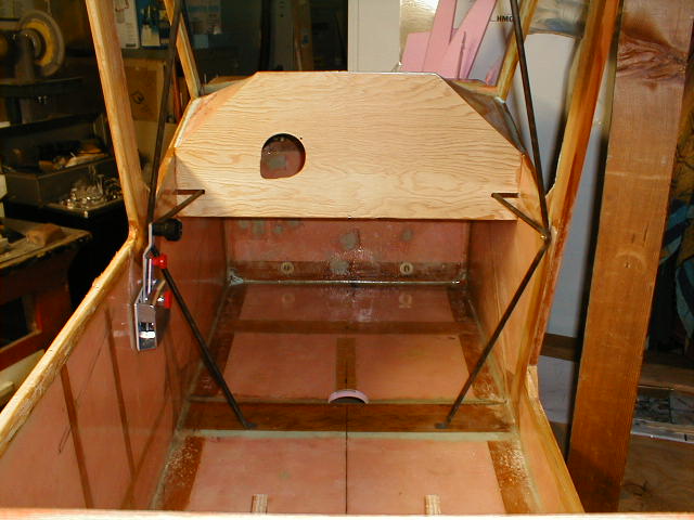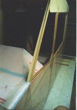 This is a shot of the inside of the cabin, just showing one of the cabin brace struts being fitted, as well as the two angle wedges used to support the top deck. Also maybe visible is the area where a cutout will be made for the control stick universal. The strip of 1/4" ply at the center of the floor was glassed in to provide something to fasten my metal floor scuff plates to.