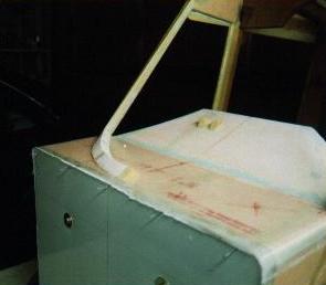 Here is how I did my 'horns' where the wing chord plate sticks forward of the main through-spar. I deleted the section of roof over this area, wrapping my windshield back to the main through-spar to provide more forward/upward visibility. There is a piece of 1/4-round molding at the top edge of the through-spar to attach the aft edge of the windshield to. The top edge of the 'horn' is a piece of scrap wood shaped to follow the curve of the chord plate but 1/8" smaller to allow the polycarbonate windshield to end up flush with the outer edge. Then the rest of the horn is filled in with foam and glassed over (not yet glassed in this photo), to add stiffness to the horn now that it doesn't have roof to stiffen it. Bottom edge of the 'horn', the white part, is a piece of plastic molding used to join two sheets of wall paneling, but I'm using it to hold the top edge of my side window.