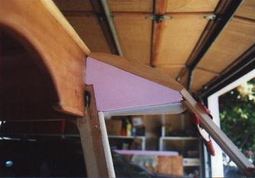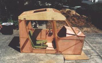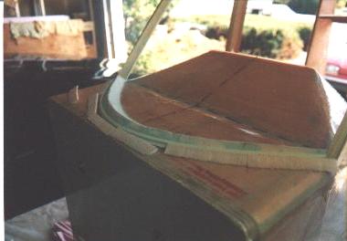Tricky stuff, eh? Notice that the sloped member which carries the edge of the windshield is cut at a variable angle from top to bottom. Since the windshield is curved at the bottom but flat at the top, I decided to try cutting a twist into the framing member. Mark, my building partner, fed the wood through the saw at a steady speed while I cranked the blade angle adjustment. We practiced on about 6 scraps before we got it right, but it turned out pretty nice.