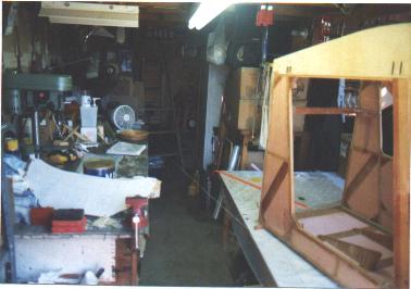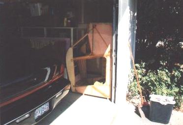 This is what I did with the cabin the winter of '99 so I could free up my building table to do the empennage. Neat, huh? But it sure looks small and lonely there in the corner of the garage. I later pulled it back out to test-join the empennage to it and turn it into a real airplane fuselage! For real!