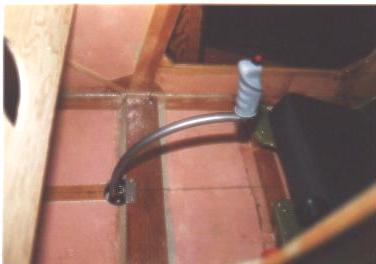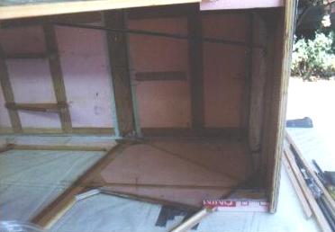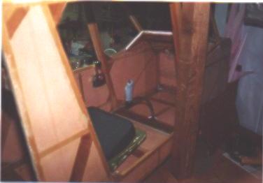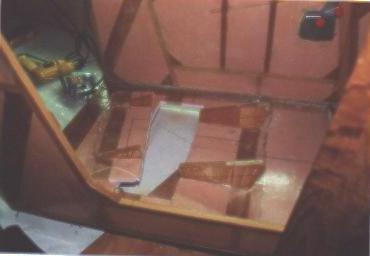 Now this really hurt. What I did was mark and cut out a rectangular hole in the floor of my cabin. The cutout piece is to the left of the hole. The two 3/4" plywood seat supports also got cut down 2". The object of this exercise was to gain headroom in the cabin. Additional floor framing yet to be added to strengthen where I cut out the floor.