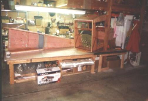 Here is what my expanded workspace looks like. I added 4'x4' to the previous 8'x4', giving me a-l-m-o-s-t enough to build my wings on. The problem is that there is a support post running through one side of the table ;o( But at least I have more space and a bit more organization (!) My engine is under the table at left, covered with plastic. Fiberglass cloth roll is the white stuff right below the center edge of the table.