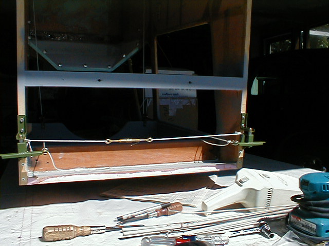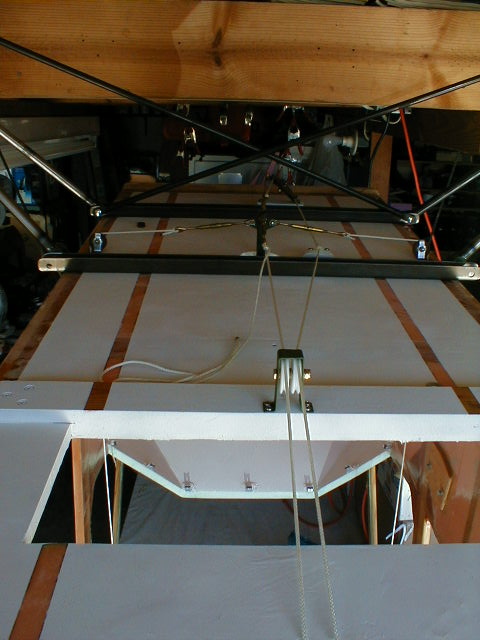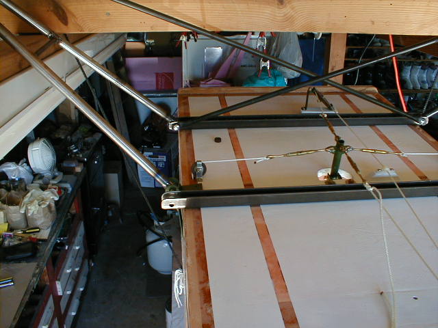 Here is a view of the airplane cabin on its back, with the landing gear temporarily attached to the brackets. Pay no attention to the hardware; it's all temporary. As you can see, I'm running out of space! The garage door opener hits the gear leg, so things have to move. Also visible are the inside of the top cowl (white primer), instrument panel mounting clips, and white cord temporarily installed as "control cable" to verify routing and proper clearances for everything.