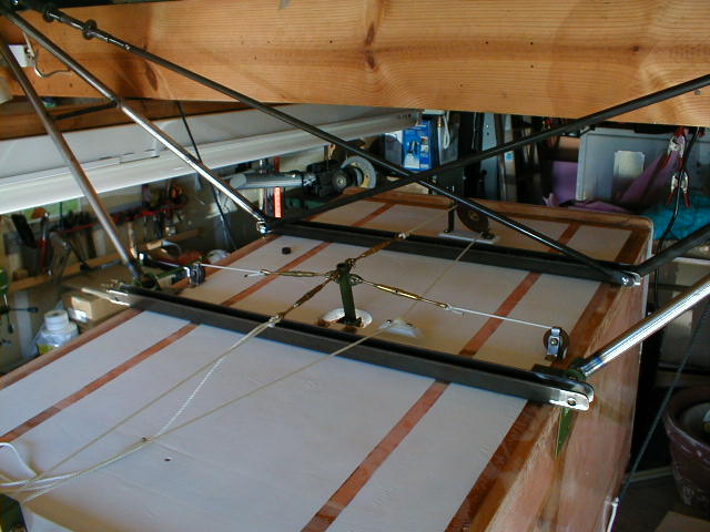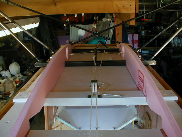 Here is a view of one of the lower aileron cable pulleys (not in its final exact location, just sitting there). You can sort of see how the cable is then routed from the stick up through a hole in the floor to the upper pulleys at the main through-spar.