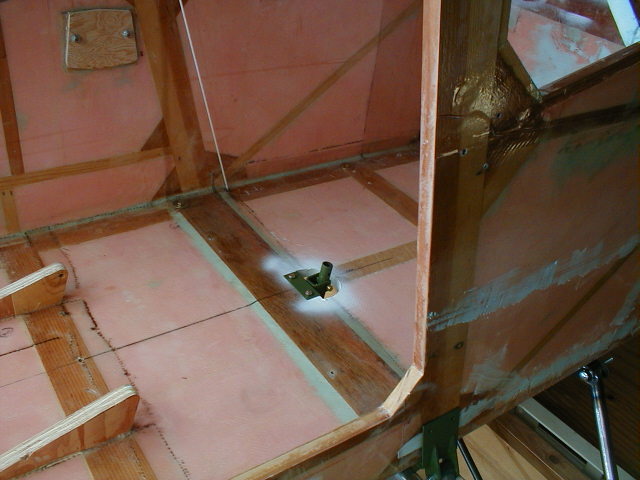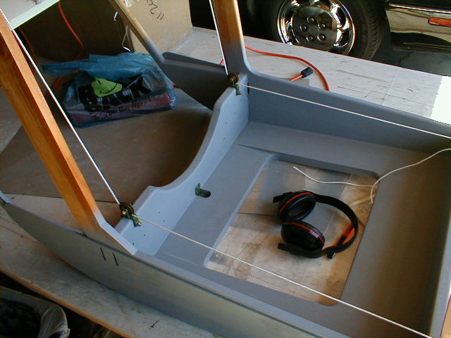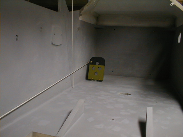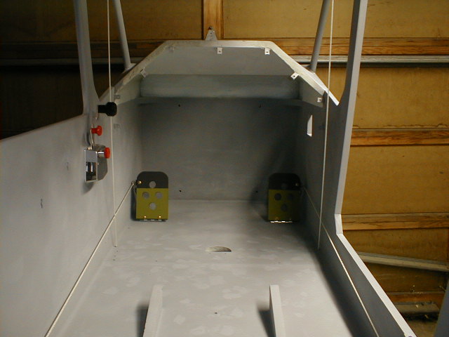 Here's what the inside is looking like at the end of October 2000, with rudder pedals temporarily installed so I could check cable routings and angles. It's white twine, not real cable. Also installed twine at the aileron cable routings, again so I could check clearances and routings. I was concerned about the starboard rudder cable clearing the opening for the cabin door, but it clears nicely. Visible on the starboard side is the cabin air door opening. Pay no attention to the pockmarks and rash all over the floor; those are where I've had to fill and sand rough spots, and they will disappear once I do final sanding and priming.