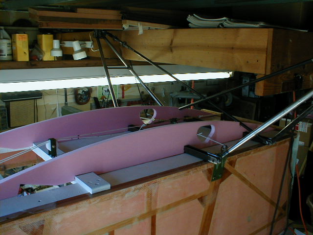 Here is a shot with the belly ribs temporarily installed. Note the cutout holes for the aileron cables to pass through. I made mine rather large, to allow getting at things through there besides just allowing the cables to clear. Also visible is the double idler pulley for the elevator cables to clear the bottom of the seat (seat is not installed in this photo), and the notches in the belly ribs for the spring struts. Not sure how I will smooth and fair the holes in the belly where the spring struts emerge.