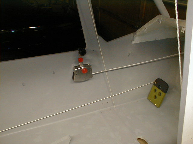 Here's a closer shot of the stick and cables, from another angle. I had to install a fairlead for the elevator cable coming back from the reversing pulley, to get things to clear. However, as you can see from this angle, I've got to move the fairlead and mounting block because the angle that the cable leaves the pulley is too radical. The double pulleys are the "idlers" required to offset the cables under the bottom of the seat (I lowered my seat, which required that I cut a hole in the cabin floor, which required that I add the seat support brace running across the bottom, which required that I add pulleys, which... oh well, you get the idea)!!