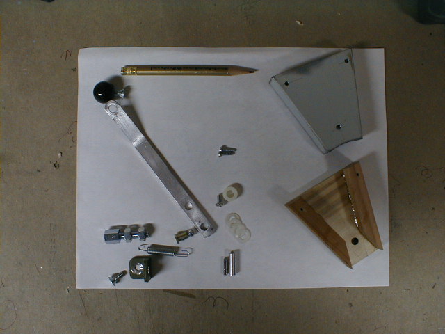 Here's the exploded view of the tailhook release lever. Just a bunch of pieces made from "table scraps". This view shows a small black hardware store knob, while the previous photo shows a wooden drawer pull, painted red. Not sure which one I'll end up using.
