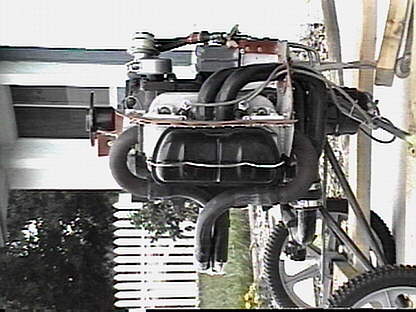 This is the 1835cc Volkswagen engine which I bought from Tom Andersen in Florida. It is normally aspirated, carbureted (Zenith), has a single Slick magneto for ignition, no starter or alternator (no accessory case), and was built up from a Great Plains Aircraft Supply kit. It is nominally rated at 65 HP (limited to 5 minutes at 3600 RPM for takeoff power), cruise output is about 60 HP at 3400 RPM. Tom says that the engine ticks over nicely at low idle, starts with an easy flip of the prop since it has an impulse-coupled magneto, and only has 5.5 hrs. on it since being built and subsequently removed from a KR which had the roof of its hangar collapse on it.