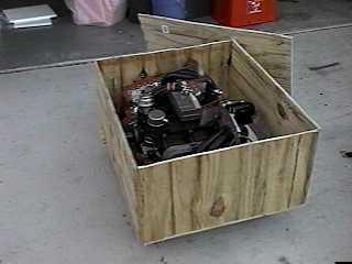 Here is the engine crated up and ready to UPS from Florida. Tom had promised me he would paint large red "up" arrows and lettering on it. (But can UPS handlers read?) ;o) The plywood from the crate has served many purposes, including making my seat and rudder pedal mockups. The carrying handles were installed on a Corvair crankshaft shipping crate (the Corvair is a whole 'nother story; it's for the KR). Nothing is wasted!