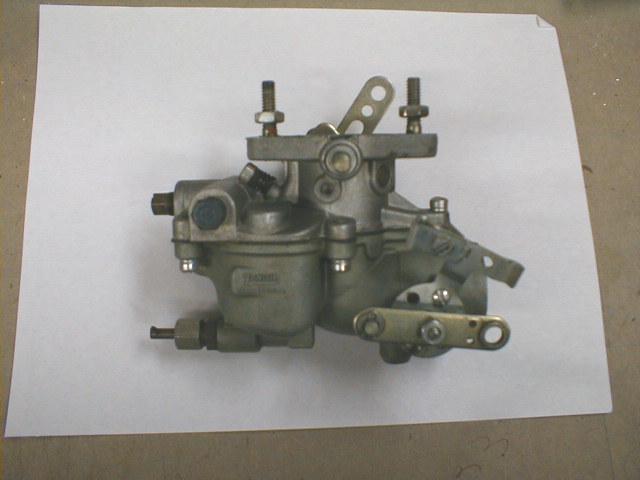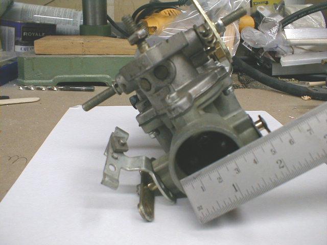 Side view of the Zenith carb I'm using. Quite a clean and simple updraft design, and it's reconfigurable to have any of the functions or connections on either side. That is, the throttle, choke, and fuel inlet can be on either side since the shafts and ports are duplicated on both sides.
