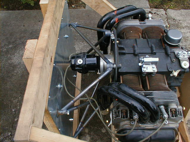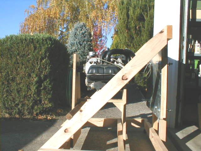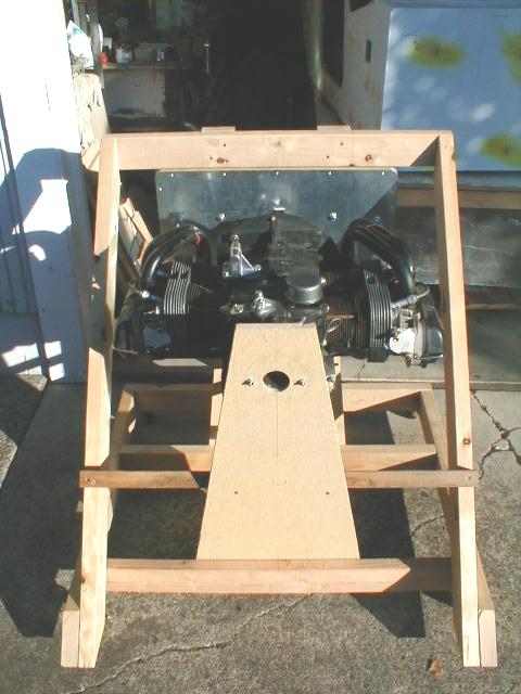 Top/front shot of the engine, stand, and jig. The space between the engine and firewall is a bit more than on Marvin's prototype due to my engine having a rear-mount magneto. Space is about 3" more than stock.