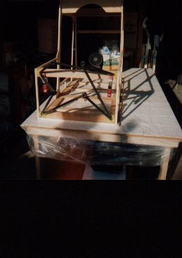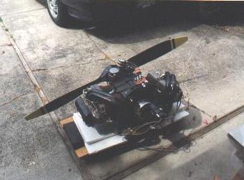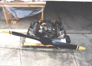 Here is a shot of my engine, with prop temporarily hung in place. The neighbors really sat up when I was out messing with this ;o) Normally, I keep the engine on the mechanic's creeper, tucked under my building table where it will stay clean. I'm working on having Jeff Sterling build up my engine mount right now, planning on hanging the engine in a few months when I get the fuselage on its gear.