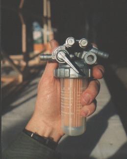 This is the fuel gascolator I'll be using. It's from my local Kub*ta lawn tractor dealer, and as you can see, it includes a shutoff valve for servicing the disposable element. The one thing it doesn't have is a quick-drain, so I'll still need a drain at the low point of my fuel system. I'll also be safety-wiring the big spin-off top of the filter bowl so it doesn't loosen itself while operating my "lawn tractor" ;o). The gascolator mounts with one bolt through the firewall, plus a 'pip' which will mate with a small hole or indentation, to keep the assembly from turning. This unit costs way less than the aviation gascolators, and is readily available.