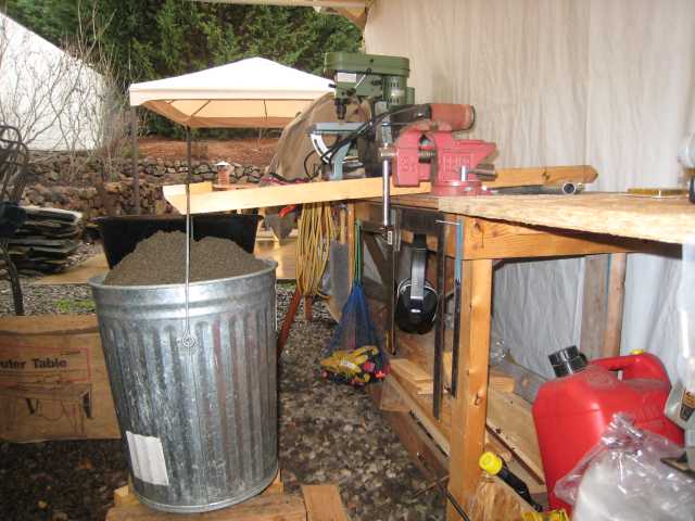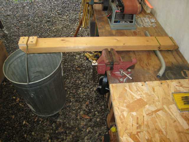 The test rig under load. The load beam is just about to touch the edge of the bench and the pail could hold no more sand, so the test was stopped here and the load was weighed. The load beam is clearly deflecting and the workbench made a few creaking complaints as the load had been added, but nothing broke or failed. The load at this point was determined to be just over 121 lbs., which means that the hinges were bearing over 900 lbs. of load. This is almost 30% more than the hinge that Vi Kapler load tested to failure, so the test was discontinued and I called it good enough.