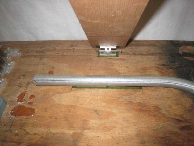 A view of the underside of the load beam showing the EMT pivot tube and the arrangement of the two hinge halves in the jig. Incidentally, the workbench that was used for the test was used by Corky Corbett to assemble the fuselage sides of his second Air Camper, NX42CC, and has traveled nearly 3000 miles from Shreveport, LA to San Antonio, TX and then to Medford, OR.