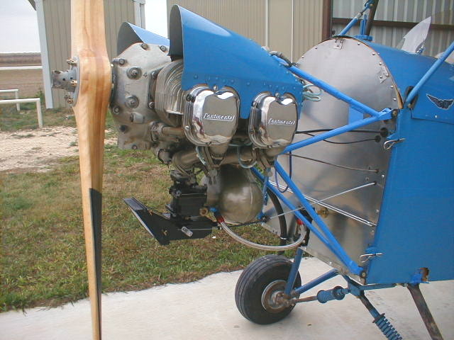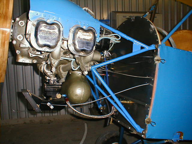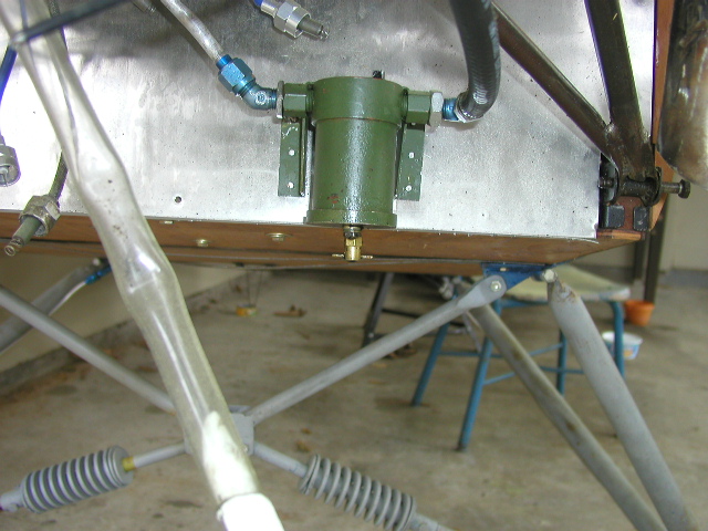 The gascolator with bulkhead fitting shows up in this picture. No part of the gascolator hangs below the lower edge of the firewall. Firewall is in two pieces in order to have the lower section removable for access or repair.