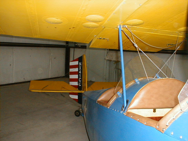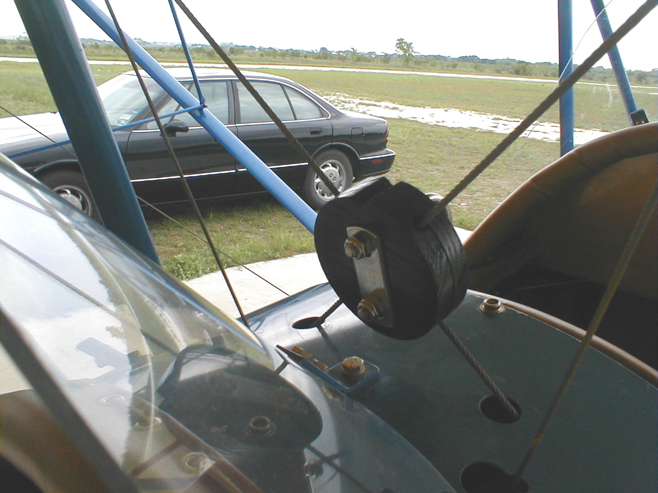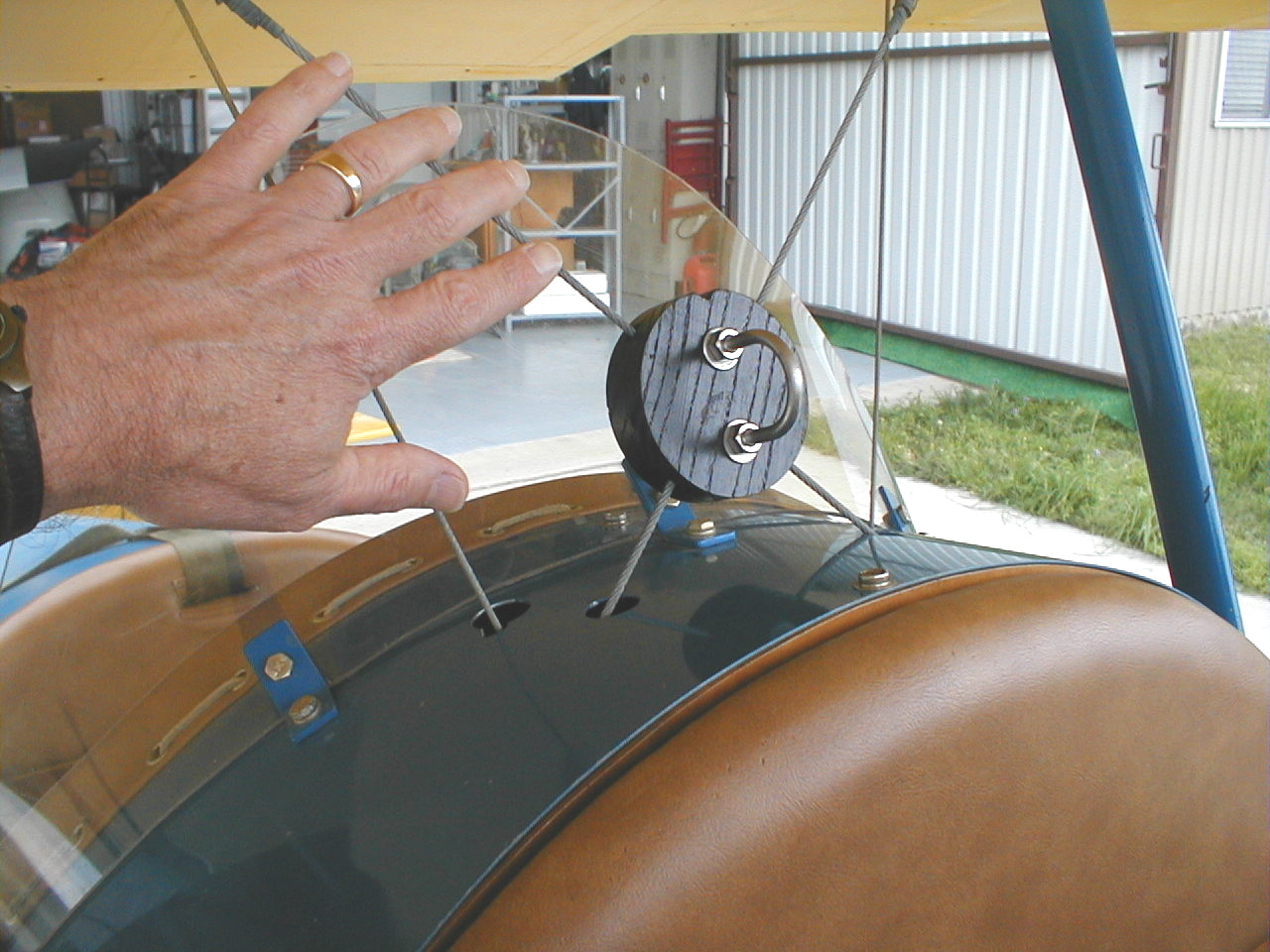 This is the shoulder harness attach point that I fabricated for the passenger cockpit on NX41CC. It follows a detail and concept that I saw in the BPA Newsletter but I tweaked things a bit. The essential part is the clamp on the cabane X-brace wires. I took two hardwood (ash) disks, clamped them together in a fixture and drilled a hole right through the center, through the joining line, on the drill press. Then I rotated the two pieces so that the groove on each disk captured one of the X-brace wires, measured and drilled two through-holes for the legs of a stainless steel U-bolt (hardware store), painted it, put some black electrical tape on the X-brace wires where they crossed, and assembled the whole thing.