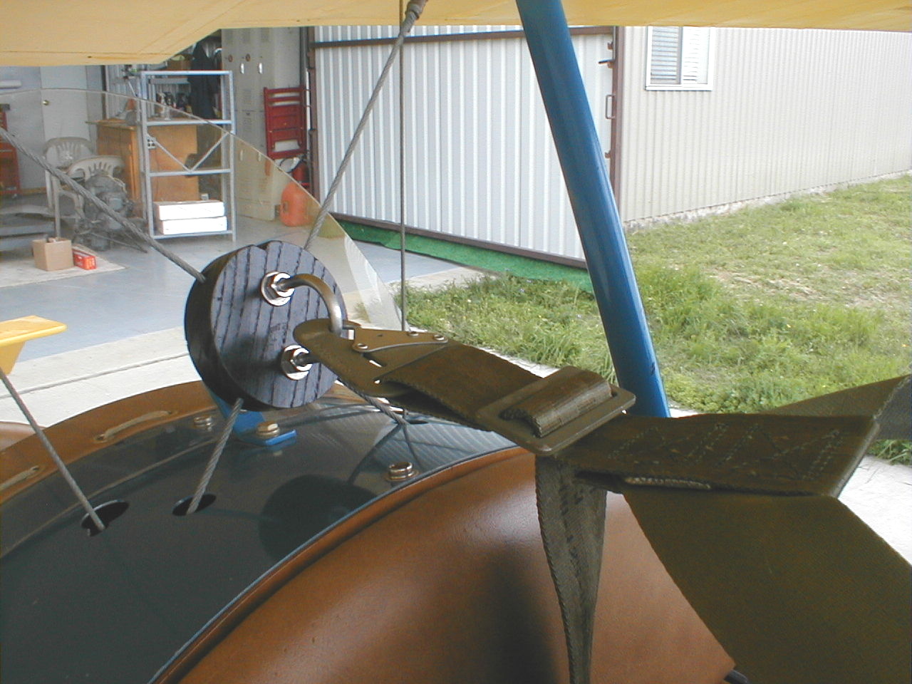 Here is the setup that Corky had on the airplane originally. A piece of cable was run between tabs at the top attach points of the cabanes and the shoulder harness was clipped to the cable. It may have been just a wee bit more comfortable for the front passenger since it put the apex of the Y a bit farther from the neck, but either setup will work. I'll fly the new setup for a while and see if it obstructs my forward vision or creates any other problems, and I've left the attach tabs for the other setup in place in case I decide to go back to the cable rather than this U-bolt setup.