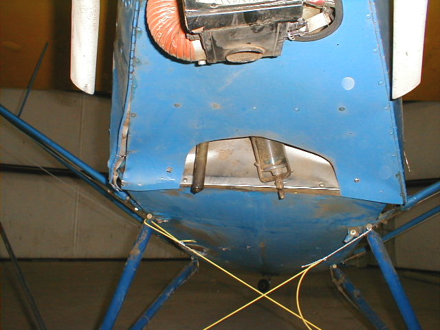 The bottom edge of the firewall also took a good deal of the energy of the falling fuselage, but Corky planned for such an eventuality and made the firewall in two halves... upper and lower. The lower half will need replacing, as will the bracket that holds the gascolator in place (and the feeder tube between the fuel tank and the gascolator). A bit of fabric on the belly, and one inspection cover on the belly, were also roughed up pretty good.