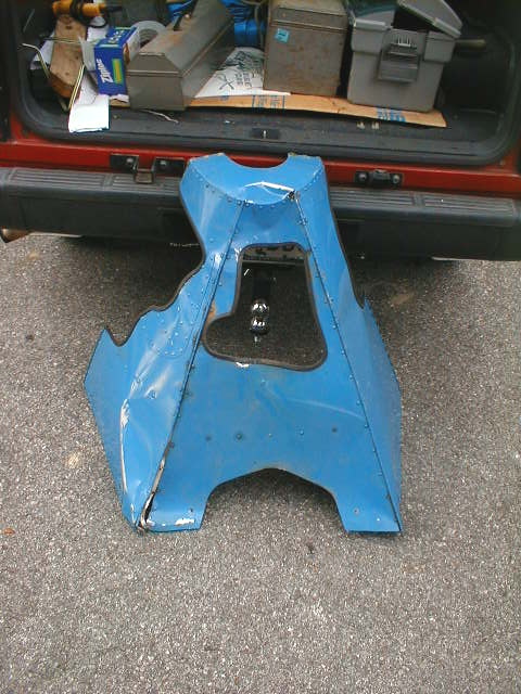 Here's the entire lower cowl, removed from the airplane. Two of the three panels have serious wrinkles and a gash, and will be replaced. Ditto the nose piece.