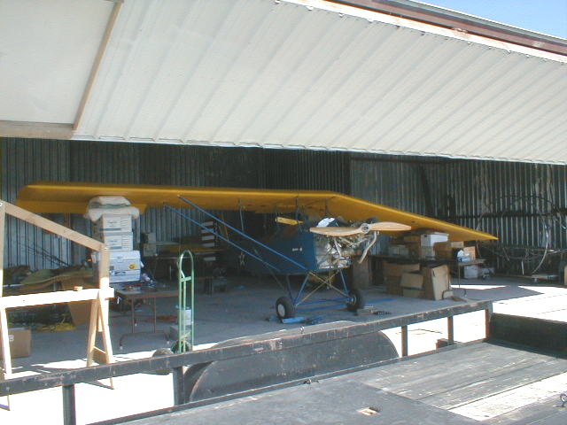 So now the disassembly and repair process begins. Wings are removed (a relatively simple task since Corky provided removable links in the aileron control cables). Here one wing is being lowered for removal.