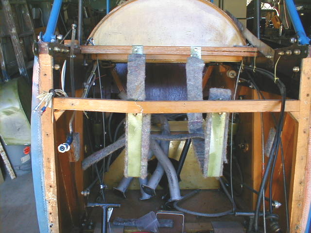 This shot shows the new crossmembers in place along with the new false front half-bulkhead that backs up the top part of the stainless steel firewall, and also shows the strap that goes over the fuel tank to secure it.