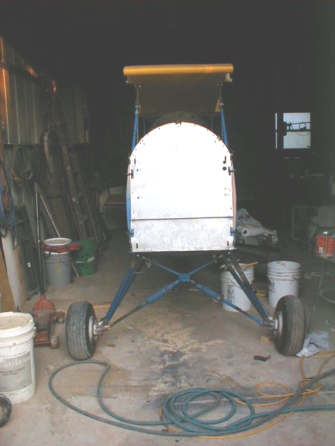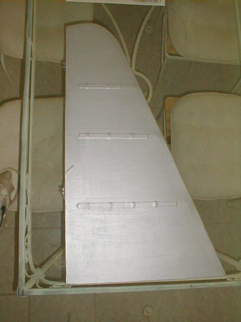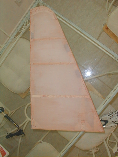 ...and then it's the Poly-Spray (silver) coat. This is the one that shows all your goofs, gnats in the wet spray, brush bristles, everything. Two cross-coats of silver, one last touch-up of drips and bubbles with 320 grit, and a final smooth wet coat of Poly-Spray before color coats. The diagonal line about halfway up the trailing edge is a seam in the bias tape. I should have cut out another piece, but am so "frugal" (read: cheap) that I went ahead and used it, splice and all. Corky had done it on the original cover job and so I carried on the tradition ;o)