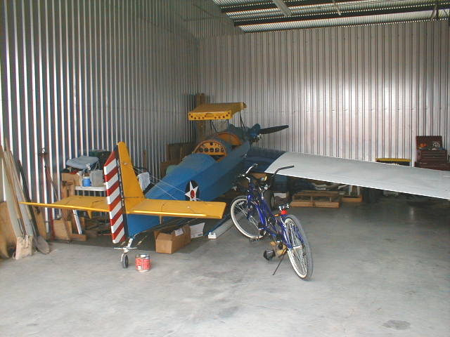 Here's the airplane, safely tucked into the hangar beside Randy Stout's Corvair-powered Zenith. Wood and fabric repairs to begin in earnest.