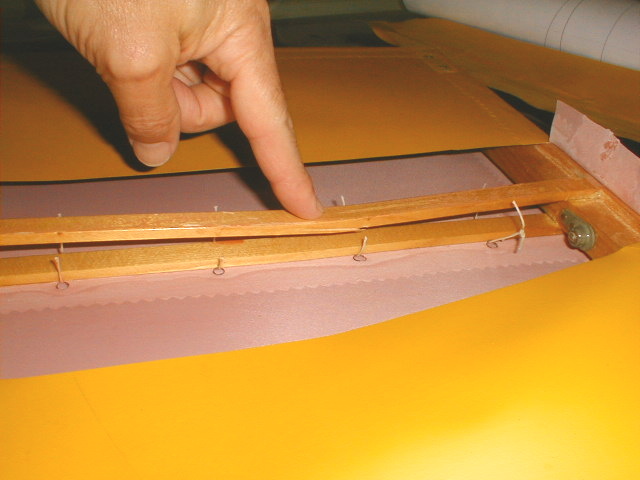 Applying reinforcing tape (peel-and-stick backing) under the rib laces, then I learned the fine art of rib lacing, the modified seine knot, and hiding the knots. Thanks to Corky Corbett for the little tip about using a soldering iron (fine tip) to make the holes for the laces. I marked where all the laces would go through the fabric, then just touched the fabric at those points and -voila- perfect little holes with the edges melted together so the fabric doesn't ravel. Same technique will be used at the places where bolts go through. After the finishing tapes are on, I'll hold the piece up to a light so I can see where the bolt holes need to go, then touch the soldering iron to the fabric and get the holes made. Great fun, this fabric covering stuff!