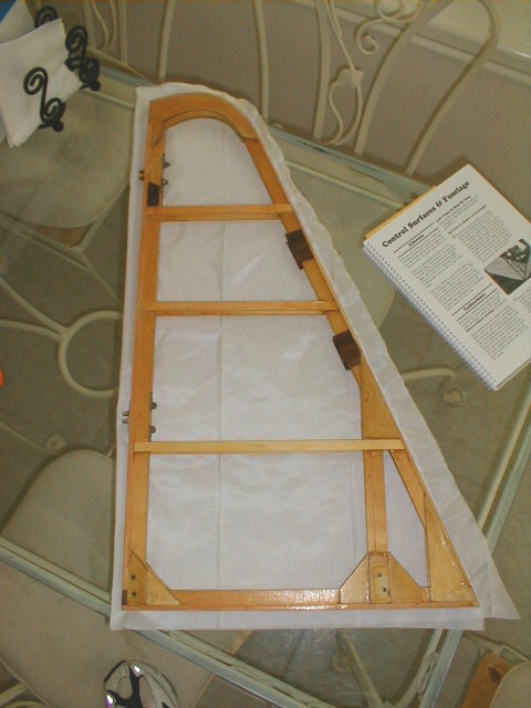 Here's the VS with the wood repairs... spliced T-stringer leading edge, with gussets at the glue joint. New lower ribs, port and starboard (thanks to my friend Tom Jack for the new ribs). And the Poly-Fiber fabric, cut to size.
