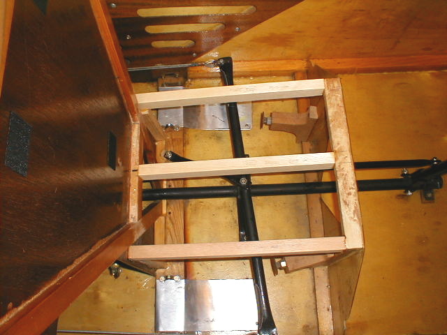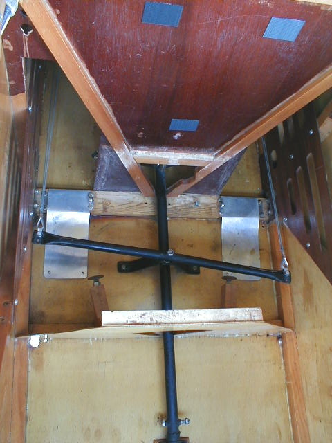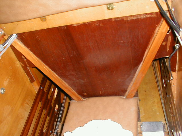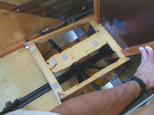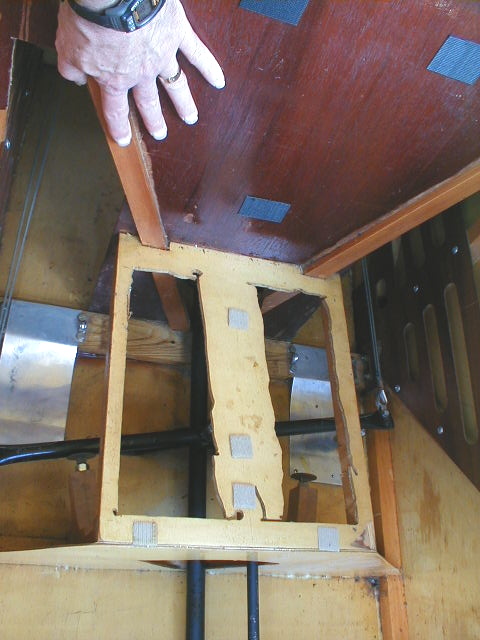 Removing the cushioned false seat bottom (which is also attached with Velcro) exposed the structural plywood seat bottom and framing. Corky had cut access holes into the seat bottom (apparently with a Rotozip, rather crudely) for access to the rudder bar and the torque tube that links the front and rear control sticks. However, two of the three framing members that support the seat were not glued to the bulkhead at their aft end (they were a bit too short to reach), so the seat was being supported by the center member and the rigidity of the seat/framing assembly. Additionally, the framing members were smaller than called for in the plans... 5/8" square as opposed to 3/4"x1" according to the plans.