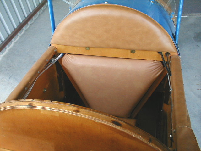 This was the passenger seat area of NX41CC as Corky constructed it. There was no cushion in the seat back area; only the seat bottom and headrest were cushioned. The seat back is 1/8" plywood and forms a bulkhead diaphragm with the two V-shaped members. And no, there isn't a huge bite taken out of the seat... that's glare from the bright sun shining into the cockpit and fooling my camera.