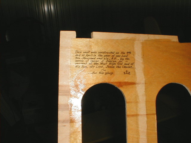 Prior to gluing in the new seat bottom (with neater, oval access holes cut in it) I needed to varnish the underside since it would become inaccessible. On a whim, I wrote a little note on the underside, varnished over the seat except where a glued surface was needed, installed it with some staples and epoxy, varnished the top, and now it's all done.