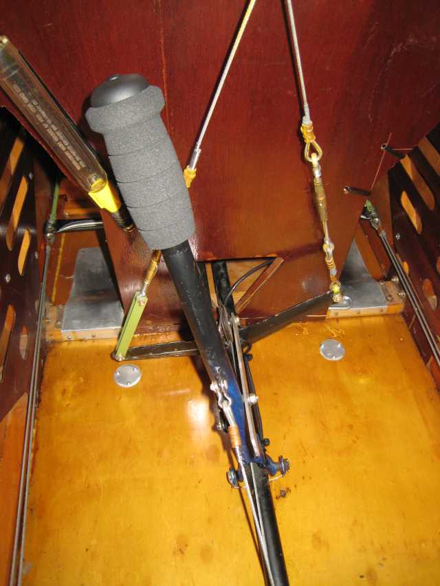 The finished installation, sort of. Shielded, twisted-pair wire from the PTT down inside the stick, out the bottom of the stick and along the underside of the walking beam forward, then up the starboard edge of the plywood front seat back. There were a couple of holes in the plywood already and they turned out to be just fine for zip-tying the wire up along the plywood to get to the fuselage side. I may do something cleaner and more permanent than the zip-ties, but maybe not. Fuel sampler in its holder on the port side. This type of sampler has a screwdriver tip on the end, which is very handy at times.