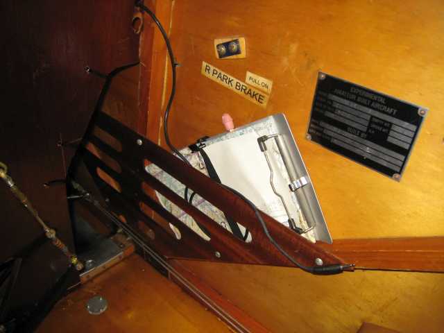 Here's the plug end of the wire, which I keep tucked in this map pocket. Visible here are the holes and zip-ties holding the wire as it comes up the seat back. While flying, I don't have a radio holder so I use the belt clip on the handheld to clip it to the edge of the map pocket. I can't see the readout or get to the buttons with it down there, but I usually only need to make one radio change heading out (ground to tower) and usually tower lets me stay on their frequency taxiing back so I don't even need to change frequencies again. Obviously the parking brakes are long gone, but I can't remove the hardware because the nuts are behind the fabric and they spin when I try to remove the screws. I should do it though... it's useless clutter. The labels, too. It just means sanding and re-varnishing.