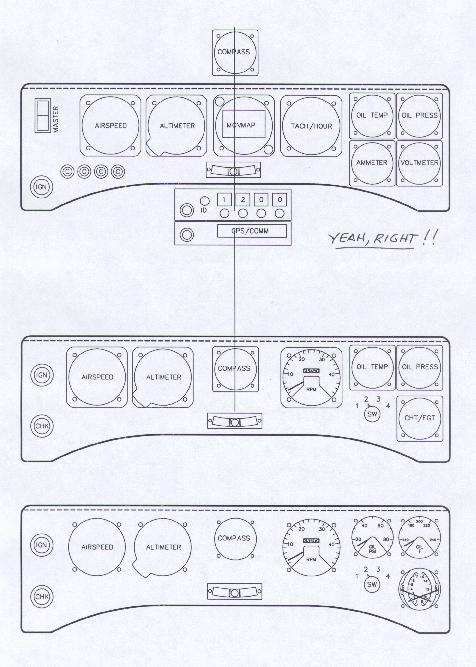 These are some studies of the M-19 instrument panel. The first one shows how impossible it is to fit radios into the panel. The second one shows a probable layout of my own panel, with instruments mounted from the front. The third one shows the same thing, but with instruments mounted from behind. Included is a selector switch for reading CHT from all 4 cylinders; I probably won't do this after all.