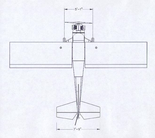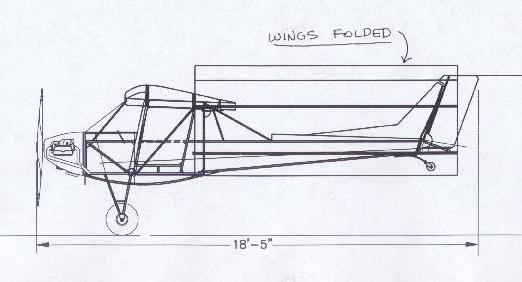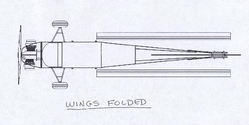 Top view with wings folded. It's no wider than the main gear track, which is about 5 ft., and remember that the horizontal stabilizer/elevator assemblies also fold up alongside the vertical stabilizer/rudder. Very nice for getting onto a trailer behind most any normal sized vehicle, unless you own a Metro or Morris Mini.